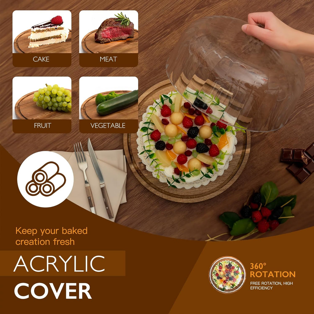- Suporte de bolo com tampa: combinação de madeira de acácia e cobertura acrílica, bonita e generosa, bandeja giratória para melhor exibição de alimentos, adequada para casamento, reunião de família, festa de aniversário, presente de panificação.