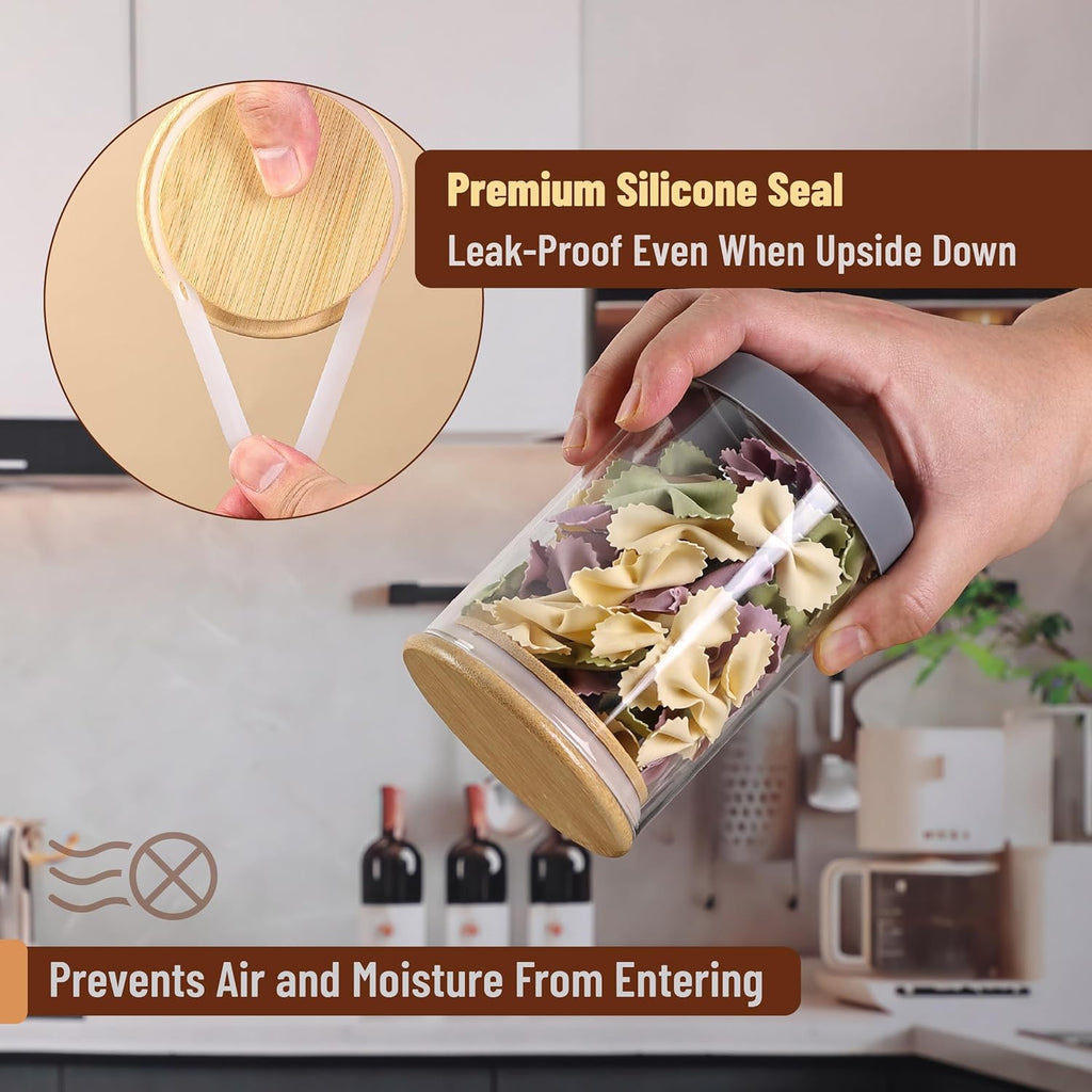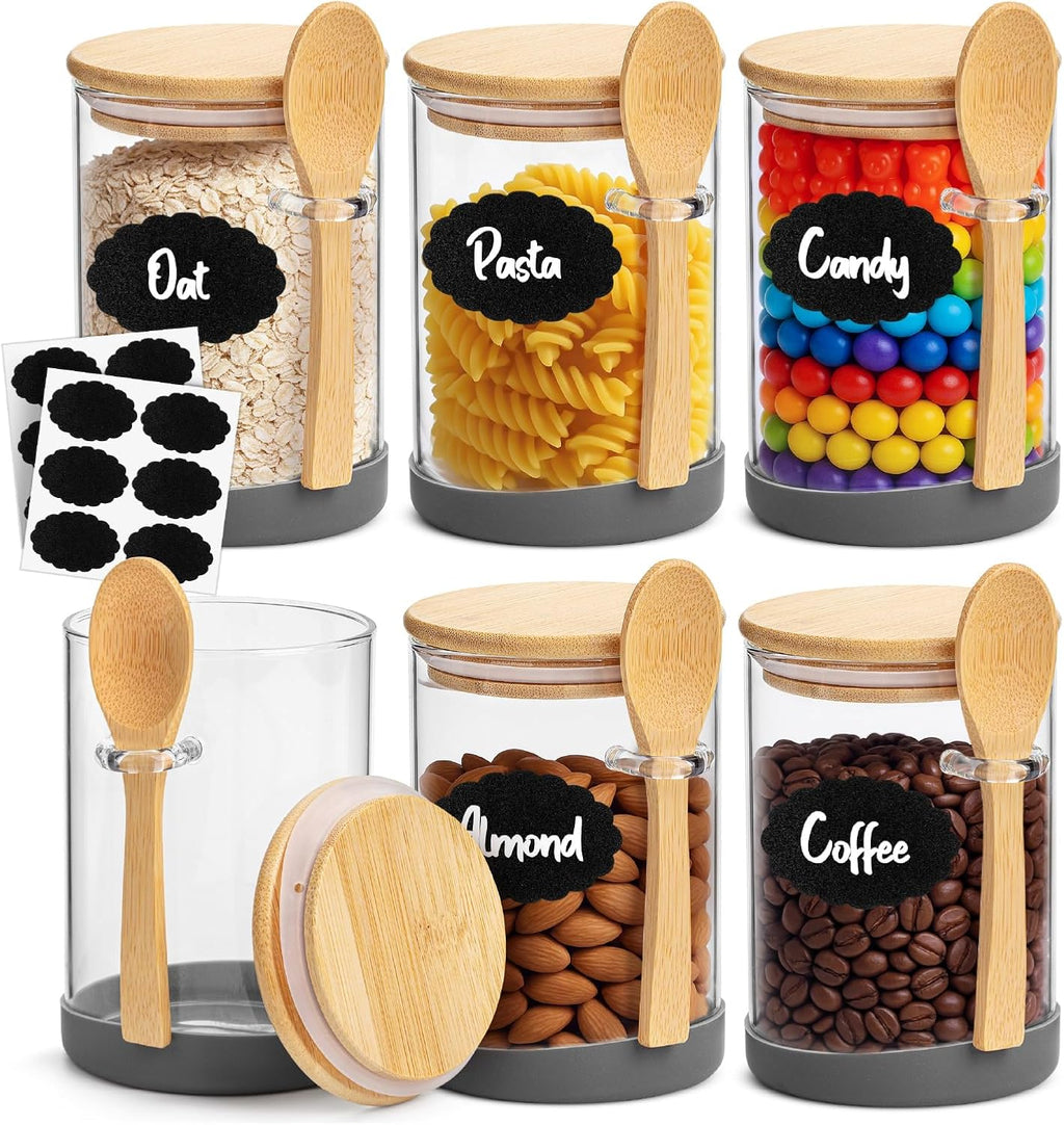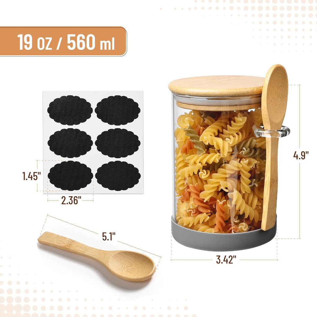 - BAMBOO LAND glass jars come in a set of 6, each with a 19 oz capacity, perfect for storing a variety of dry goods such as loose tea, brown sugar, candy, and nuts.