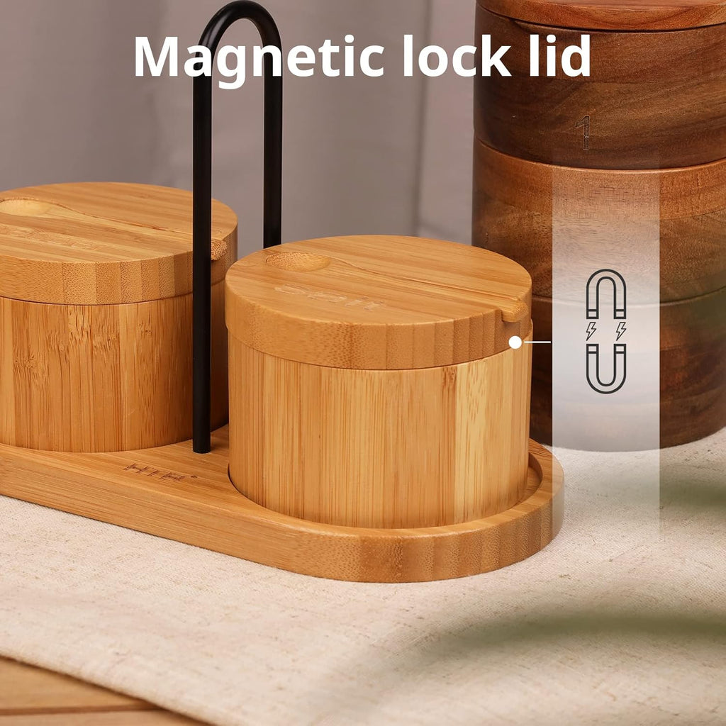 - Caixa de armazenamento de sal com tampa giratória: a tampa giratória suave tem fecho magnético, fecha firmemente com trava magnética, ao mesmo tempo abre facilmente com apenas uma mão para acesso rápido a temperos durante o cozimento.