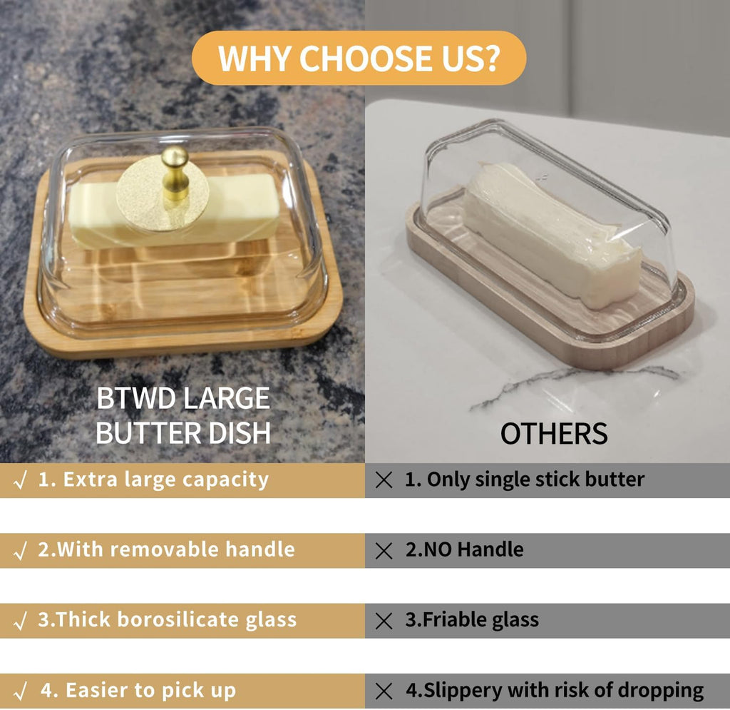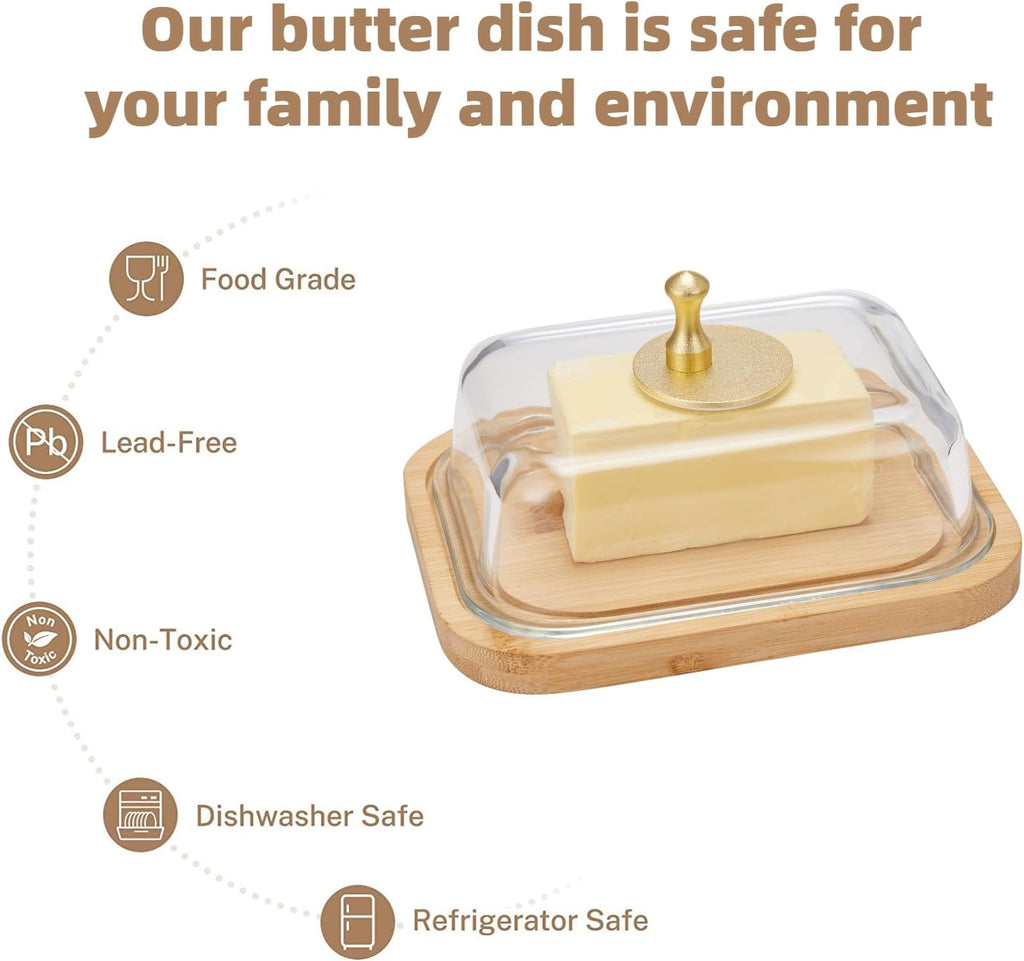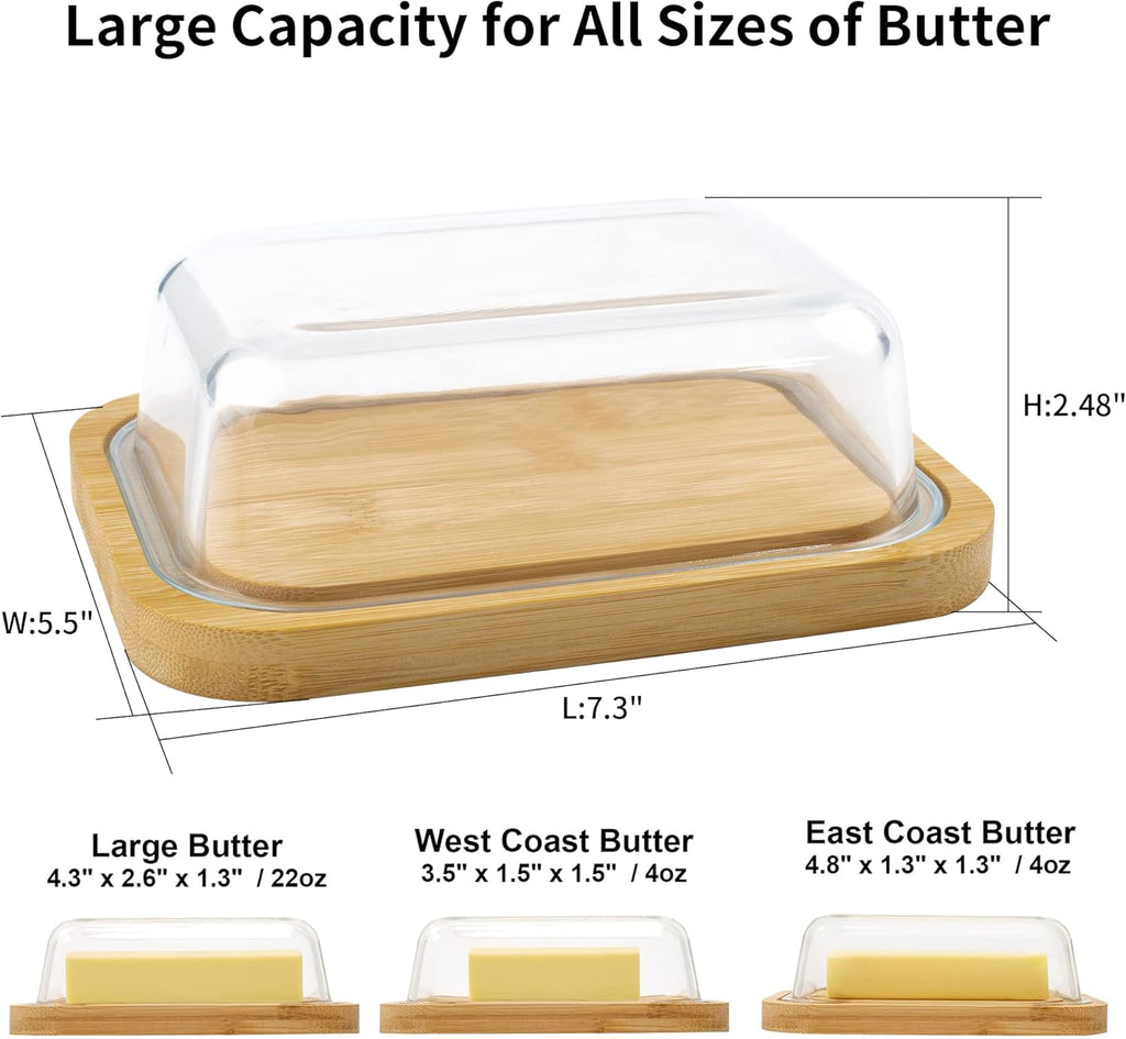 - 【Design elegante e natural】O protetor de manteiga é feito de vidro borossilicato de alta qualidade e base de bambu natural. O fundo plano da manteiga facilita cortar manteiga, especialmente se você quiser fatias finas e este prato também pode ser usado como tábua de queijos. A capa transparente permite que você veja a quantidade de manteiga restante. A manteiga coberta com uma faca de manteiga de aço inoxidável garante a fácil propagação da manteiga.