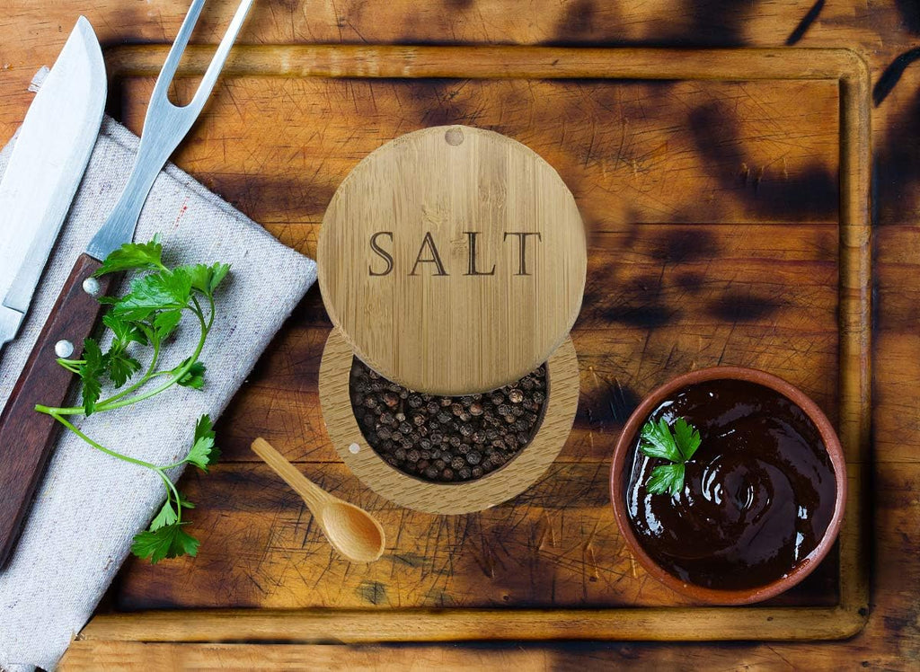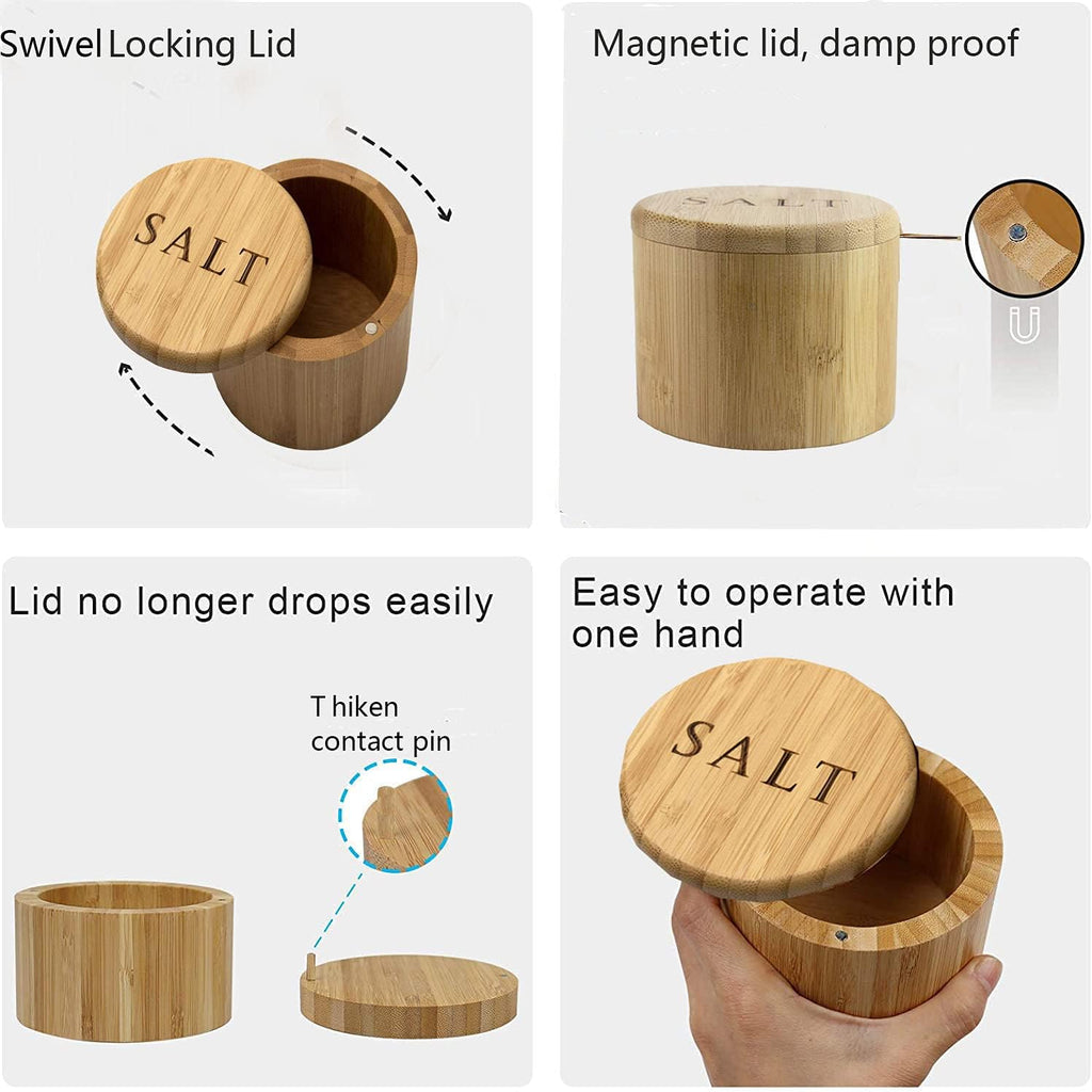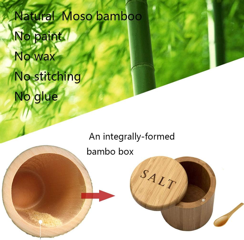 Saleiro, caixa de sal de bambu, recipiente de sal com colher, suporte de sal com tampa, saleiro, cominho e tigela de pimenta com tampa giratória magnética