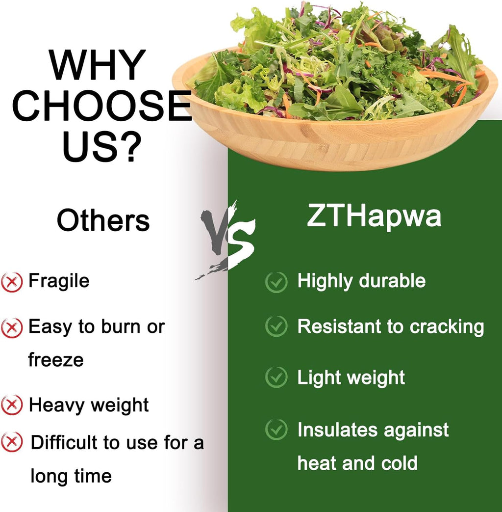 • ✅ Bambu natural premium: Feito de bambu 100% natural com revestimento de qualidade alimentar, nossas tigelas de salada são duráveis, fáceis de limpar e mantêm seu acabamento fosco rústico. Não requer lubrificação - retém o brilho após lavagens repetidas.